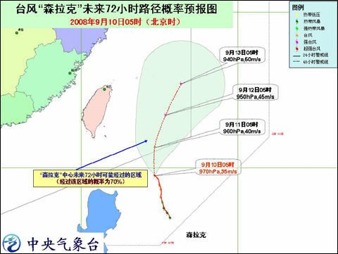 今年第13號(hào)臺(tái)風(fēng)“森拉克”(SINLAKU)今天5時(shí)位于中國臺(tái)灣省恒春市東南方向大約490公里的洋面上,也就是北緯19.5度,東經(jīng)124.7度,中心附近最大風(fēng)力有12級(jí)(35米/秒)。預(yù)計(jì),“森拉克”將以每小時(shí)10公里左右的速度緩慢向偏北方向移動(dòng),強(qiáng)度繼續(xù)加強(qiáng)。