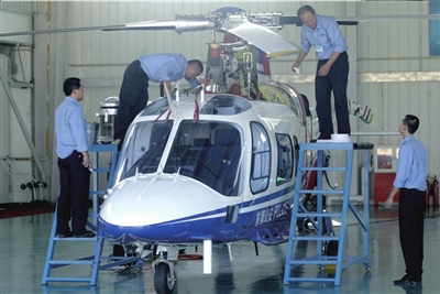 機(jī)務(wù)人員在對(duì)一架直升機(jī)進(jìn)行保養(yǎng)檢查工作。本報(bào)記者 董世彪 攝