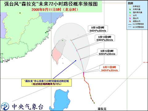 9月11日5時強臺風“森拉克”未來72小時路徑概率預(yù)報圖