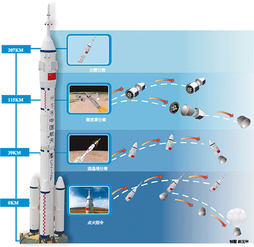 從火箭發(fā)射前30分鐘到起飛后120秒、飛行高度在39千米時逃逸塔分離,以及從120秒到200秒左右、飛行高度115千米時整流罩分離這兩個時間空間段內(nèi),萬一發(fā)生意外緊急狀況時,逃逸塔就會啟動,靠固體燃料火箭發(fā)動機提供巨大的瞬間推力,將航天員所在的飛船從火箭上拉出來,帶著航天員偏離火箭的運行軌道,逃離險境,然后借助降落傘和緩沖裝置安全降落到地面。由于增加了逃逸系統(tǒng),長征二號F火箭的安全性指標由過去發(fā)射100次可能出現(xiàn)3次危及航天員生命的問題,減少到現(xiàn)在發(fā)射1000次才可能發(fā)生3次這樣的事故,達到了國際先進水平。