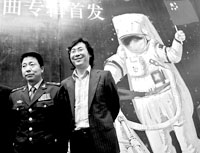 發(fā)布會(huì)上首次公布了隨“神七”飛船飛天的100多首歌曲,其中包括全新創(chuàng)作的15首航天歌曲專輯。楊利偉表示,“我深愛《我為祖國感到驕傲》這首歌,每一次聽到都會(huì)感到心情激動(dòng)。那就是我們航天員回到地球打開艙門時(shí)最想說的第一句話,是我們的真情感受!北九_(tái)晚會(huì)的音樂總監(jiān)、蒙族音樂家恩克巴雅爾也是 《我為祖國感到驕傲》的曲作者,他介紹說:“這一百多首歌曲有郭蘭英演唱的《我的祖國》、宋祖英演唱的《望月》以及成龍演唱的《男兒當(dāng)自強(qiáng)》等。”(記者 李澄/文 鄒紅/攝)