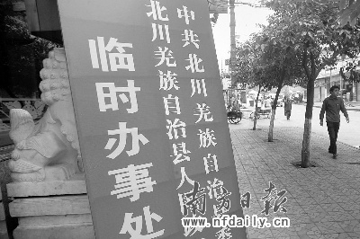 由于北川新縣城選址一直待定,北川縣委、縣政府的駐地在災(zāi)后數(shù)易其址。從最初北川中學(xué)附近的帳篷,遷至北川擂鼓鎮(zhèn)的帳篷。期間,還曾在安昌鎮(zhèn)天龍賓館的大堂設(shè)立臨時(shí)辦事處?h里的各委、辦、局則擠在旁邊的一間火鍋店里,甚至“三個(gè)單位合用一個(gè)桌子”。后來化整為零?h級(jí)61個(gè)單位分散租用安昌鎮(zhèn)的民房作為辦公地兼集體宿舍。