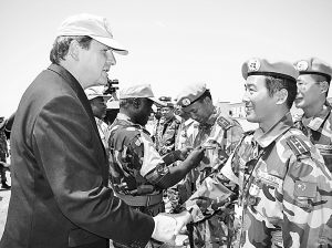 中午12時30分,授勛儀式在莊嚴的聯(lián)合國會歌中拉開帷幕。中國維和官兵頭戴藍貝雷、腳穿陸戰(zhàn)靴、頸圍藍絲巾、手持鋼槍,身著佩有非盟徽標和中國國旗標志的迷彩服,個個英姿勃發(fā),接受了羅伊與阿瓜依的檢閱。隨后,兩人又與阿達達以及中國駐蘇丹武官吳樹陳一起,為官兵們佩帶聯(lián)合國和平勛章。