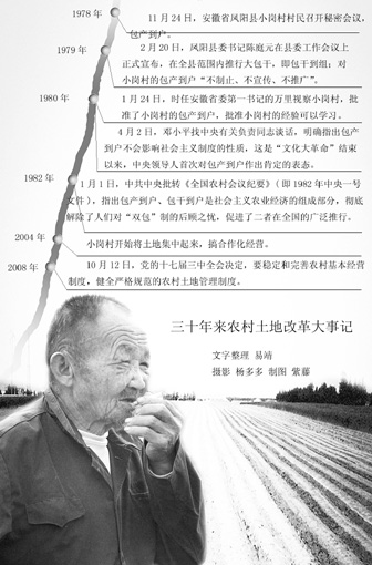 30年前的1978年11月24日,即為中共十一屆三中全會(huì)做準(zhǔn)備的中央工作會(huì)議閉幕的前一天,小崗生產(chǎn)隊(duì)的18家農(nóng)戶,聚集在冬日寒風(fēng)中的一間破舊茅舍里,昏暗的燈光下,18人用粗糙的手指在一份事先準(zhǔn)備好的“包干到戶保證書”上按下了堅(jiān)實(shí)的手印,為此真正拉開了農(nóng)村“包產(chǎn)到戶”責(zé)任制的序幕。