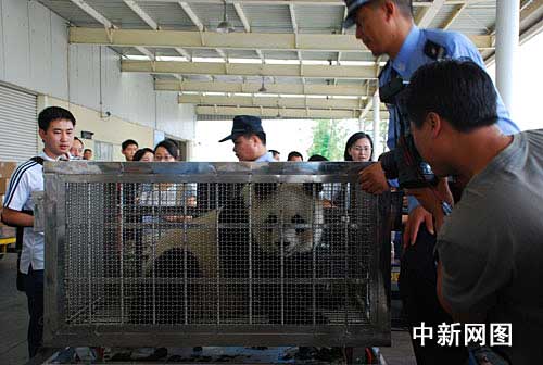 小家伙呆在鐵籠里正被工作人員小心翼翼地抬起來(lái)搬到貨車(chē)上去。作者:周航健
