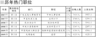 據(jù)初步統(tǒng)計(jì),2009年公務(wù)員考試的報(bào)名人數(shù)已經(jīng)超過2008年的80萬大關(guān)。同時(shí),最熱門職位的競(jìng)爭率也是三年來首次超過4000:1,中國殘疾人聯(lián)合會(huì)組聯(lián)部基層組織建設(shè)一職已經(jīng)有4584人爭報(bào)。較之2008年最高供需比3592:1“更上一層樓”。