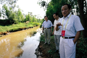 三位暗訪的省人大代表在排放口仔細觀察!斑@里肯定存在偷排污水現(xiàn)象,否則怎么會淤積這么厚的黑泥?”省人大環(huán)資委副主任委員潘大林說。他還指給記者看,排放口上游河岸兩邊是黃泥,到下游就變成黑色,水面也開始漂浮油污。