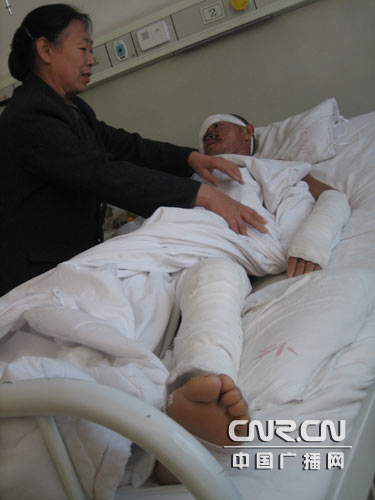 通過兩個村村民的描述,我們對事發(fā)當天的情況有了大致的了解。當天上午8點多,行兇者首先出現(xiàn)在艾各莊村,毆打了現(xiàn)場的幾十位村民,隨后這伙人又來到霍其營,同樣的暴行再次上演。兩個村子共有19位村民被送往醫(yī)院接受治療。在廊坊市人民醫(yī)院記者見到了一部分受傷的村民。受傷最重的是霍其營的村民李連才,當時他正路過鐵路橋下,去接自己的岳母回家,不明所以便被忽然圍上來的人打了一頓。他只清晰地記得那些人穿鐵路十七局的工服!拔叶疾恢涝趺椿厥聝。結(jié)果就跑,那就不知道了以后!贬t(yī)生介紹說,李連才的顱骨骨折,滿口的牙都被打掉了,身上也多處骨折。醫(yī)生為記者介紹了他的傷情:“把這個皮膚連頭皮全部裂開以后,里邊能看見骨折線。顱底骨折呢,他來的時候有鼻出血,耳有鼻漏。還有他鼻骨折了,我們照片子他確實是折了,而且他來的時候滿口的牙都掉下來了,幾乎就沒有多少牙在上面了。出院以后三個月以后要鑲牙的。面部這個皮裂傷也挺重的,也縫了也是挺嚴重的。跟腱部跟他后邊的皮膚裂傷,就因為他后部皮膚裂傷,造成跟腱整個兒就撕下來了!