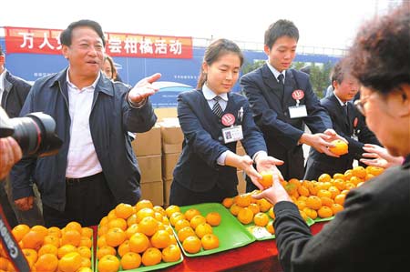 昨日(2日)上午,農(nóng)業(yè)部副部長(zhǎng)陳曉華、副省長(zhǎng)張作哈、省農(nóng)業(yè)廳廳長(zhǎng)任永昌來(lái)到成都春熙路街頭廣場(chǎng),帶頭吃下蜜柑,以此消除人們品嘗柑橘的顧慮。昨日由省農(nóng)業(yè)廳、成都市農(nóng)委、成都市商務(wù)局共同主辦的“萬(wàn)人免費(fèi)品嘗柑橘活動(dòng)”在全市各大超市舉行。全省各柑橘主產(chǎn)地也同時(shí)開(kāi)展了免費(fèi)品嘗活動(dòng)。