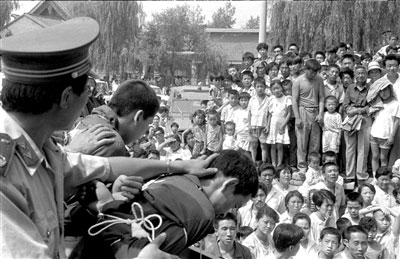 同時(shí),留在人們集體記憶中的,還有公判大會(huì)。劉仁文說,當(dāng)時(shí)被押到現(xiàn)場的犯罪分子,戴著畫了大紅叉的木牌,垂頭喪氣,聽候著聲勢浩大的審判。臺下,上萬名群眾都在圍觀,人們竊竊私語,“這不是誰誰家的兒子嗎?聽說搶了幾千塊錢,被判死刑了。”