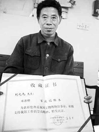 劉元九展示國(guó)家博物館頒發(fā)給他的收藏證書。