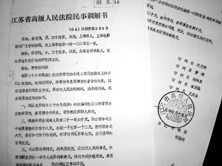 24年前,1984年4月,因?yàn)樽髌泛献鞫l(fā)的電影故事片《十六號病房》編劇署名之爭,在雙方“筆墨官司”糾纏了八九個月之后,上海電影制片廠文學(xué)部編輯姜思慎以侵犯著作權(quán)之訴,將小說《遺忘在病床上的日記》的原著作者喬雪竹告上了法庭。該案成為我國建國以來首例著作權(quán)糾紛案,一時引起了中外輿論的高度關(guān)注。
