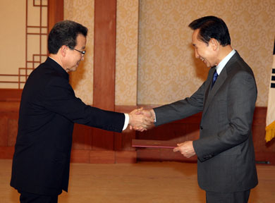 隨后程大使到接見廳向李明博總統(tǒng)遞交國(guó)書。韓外交部長(zhǎng)官柳明桓、總統(tǒng)外交安保首席秘書金星煥和中國(guó)駐韓國(guó)大使館公參邢海明、陳洲等參加了儀式。