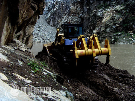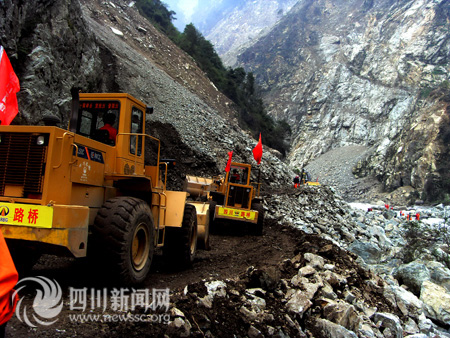 14日S303線耿達(dá)至映秀段兩路搶通大軍在蟠龍山隧道出口會(huì)師,半年來所有的艱辛隨著盡情的歡呼逐漸遠(yuǎn)去;叵胱蛱欤麄兠鎸(duì)的是一條處于特大地震震中,蜿蜒在崇山峻嶺、峽谷深溝之中,被汶川特大地震摧毀得面目全非的公路。同時(shí),映日公路耿達(dá)至映秀段路段長(zhǎng)23公里,有8個(gè)堰塞湖,山勢(shì)陡峭,根本沒有空曠地帶堆放清除的山體崩坍物,僅僅只有700米路段清除崩坍的巨石后能使用外,其余全部路段被地震摧毀殆盡。曾經(jīng)專家斷言,要重新打通S303線映日公路沒有三年兩載的時(shí)間根本不可能。面對(duì)如此的艱難險(xiǎn)阻,很多親臨現(xiàn)場(chǎng)的專家都稱,四川正在搶通一條世界罕見難度的公路?陀^條件使耿達(dá)至映秀段成為最難搶通的一條公路,但是為了恢復(fù)重建,耿達(dá)至映秀段的搶通方案幾經(jīng)論證,最終還是決定沿原路線進(jìn)行搶通。