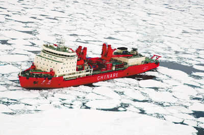 這是雪龍船在進入浮冰區(qū)后經(jīng)常遭遇的場面。