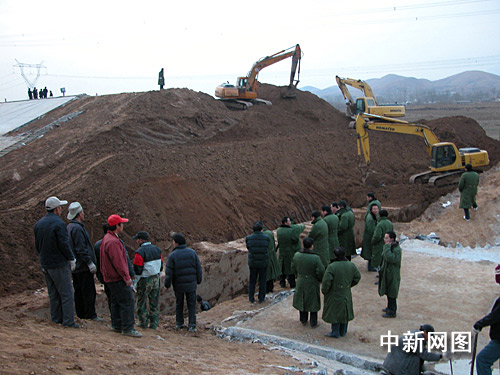 記者23日下午在現(xiàn)場看到,發(fā)生跑水的渠段已被從南北兩側(cè)攔截,有五六輛挖掘機(jī)正在作業(yè),干渠被截開近一丈寬的口子,渠底一條橫貫東西的水泥槽已明顯裸露出來。十幾個(gè)穿綠大衣的人站在截開的渠北側(cè),許多施工人員聚攏周圍。