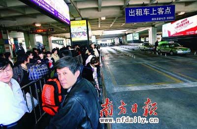 同時(shí),據(jù)天河汽車(chē)客運(yùn)站、廣州火車(chē)東站的市民介紹,出租車(chē)排著長(zhǎng)龍等待客人的盛況均已不見(jiàn)。只有三三兩兩幾臺(tái)出租車(chē),不時(shí)駛來(lái)停在候客道里。