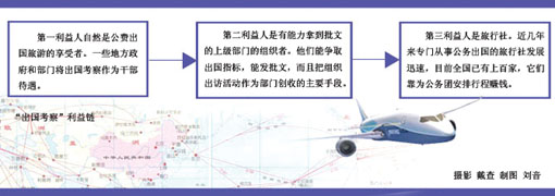 第三利益人自然就是旅行社。據(jù)了解,近幾年來專門從事公務(wù)出國的旅行社發(fā)展迅速,目前全國已有上百家,集中在廣州、上海、北京、南京、寧波等地。它們靠為公務(wù)團安排行程賺錢!艾F(xiàn)在各級各地組織的出境、出國考察活動,絕大部分是通過旅游公司出去、并由境外旅游機構(gòu)接團安排行程的,其實就是公款旅游!毙掠嗍形晃桓刹繉τ浾哒f。