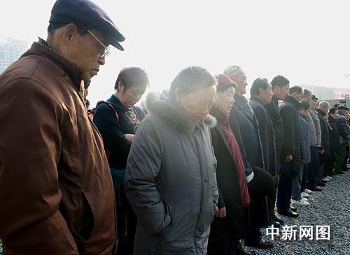 冬日的南京顯得陰冷。早上十時(shí),警報(bào)聲中,聚集在紀(jì)念館悼念廣場的三千軍民低首默哀三分鐘,并向遇難同胞三鞠躬。