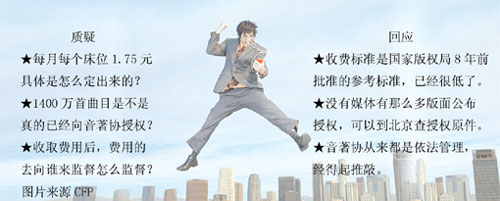 兩周前,昆明市飯店與餐飲行業(yè)協(xié)會秘書處向媒體通報,由于協(xié)商失敗,昆明市200余家賓館酒店將被迫暫時停放背景音樂。這200余家酒店包括:昆明市100余家星級酒店以及100余家硬件設(shè)施達星級標(biāo)準(zhǔn)酒店。