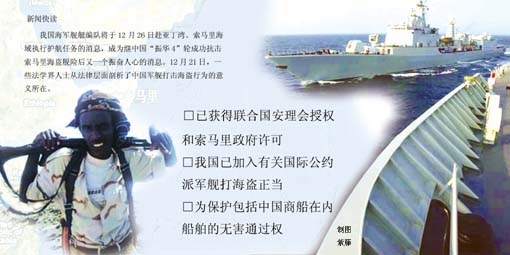 中央軍委法制局有關(guān)負(fù)責(zé)人在接受媒體采訪時說,中國軍艦赴亞丁灣、索馬里海域?qū)嵤┳o(hù)航的行動,是根據(jù)聯(lián)合國安理會決議作出的決定,完全符合有關(guān)國際法的規(guī)定。