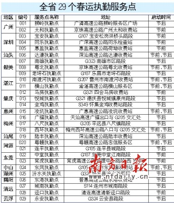 春運(yùn)期間,將在主干公路上設(shè)立29個(gè)由省廳掛牌的春運(yùn)執(zhí)勤服務(wù)點(diǎn)(見右表)。服務(wù)點(diǎn)由當(dāng)?shù)毓矙C(jī)關(guān)派民警日夜駐守,重點(diǎn)檢查7座以上營(yíng)運(yùn)客車和危險(xiǎn)化學(xué)品運(yùn)輸車輛,嚴(yán)格查處客車超員和無牌無證、報(bào)廢車上路行駛以及農(nóng)用車、拖拉機(jī)載人等嚴(yán)重交通違法行為,其中節(jié)前春運(yùn)執(zhí)勤服務(wù)點(diǎn)要從1月5日起即開始運(yùn)作。各地市還根據(jù)實(shí)際在主干公路和交通流量大的路段設(shè)置119個(gè)春運(yùn)執(zhí)勤服務(wù)點(diǎn),配備足夠的警力和裝備。如果駕駛員在旅途中遇到問題,可以及時(shí)通過這些執(zhí)勤服務(wù)點(diǎn)向有關(guān)部門求助。
