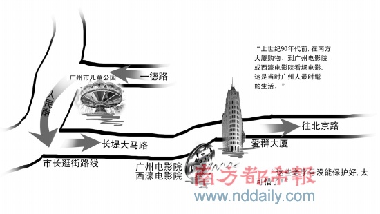 離開兒童公園,張廣寧沿人民南路向南走去。當(dāng)看到廣州電影院和西濠電影院的招牌時,張廣寧還回憶說,上世紀90年代前,在南方大廈購物、到廣州電影院或西濠電影院看場電影,這是當(dāng)時廣州人最時髦的生活。眼前,廣州電影院已變成一家KTV,而西濠電影院則變成了一家網(wǎng)吧。見此情此景張廣寧立即要求致電主管部門,了解這幾家老字號的產(chǎn)權(quán)及消失原因。