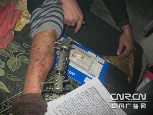走進(jìn)李權(quán)柱租來(lái)的不足10平米的小屋時(shí),屋里彌漫著嗆人的煤煙,但屋里的水缸卻結(jié)了冰。李權(quán)柱和他的愛(ài)人蜷縮在炕頭,挽起薄薄的秋褲,記者看到,一個(gè)60公分長(zhǎng)的鐵夾深深地嵌進(jìn)李權(quán)柱的小小腿上,皮膚和鐵夾相連的地方還在往外流著膿水,李權(quán)柱就拿紙纏在鐵夾上。