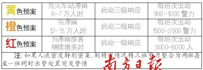 為確保2009年春運(yùn)的安全,廣州警方認(rèn)真總結(jié)和吸取2008年處置廣州火車站地區(qū)因旅客大量聚集造成嚴(yán)重安全危機(jī)的經(jīng)驗(yàn)和教訓(xùn),精心制定了2009年春運(yùn)安全保衛(wèi)工作系列方案。其中,針對(duì)火車站地區(qū)可能再次出現(xiàn)的因火車延誤或鐵路中斷造成大量旅客滯留的情況,制定了“黃、橙、紅”三個(gè)級(jí)別的應(yīng)急響應(yīng)方案和最高級(jí)別最大力量的調(diào)警方案。