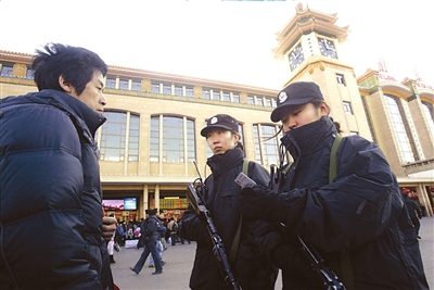 北京女特警首次亮相春運 與男特警搭檔執(zhí)勤(圖)