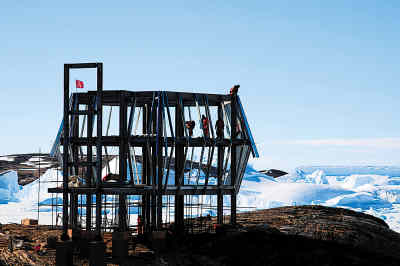 溫度、風(fēng)速、氣壓這些天氣數(shù)據(jù)實(shí)時(shí)地顯示在餐廳內(nèi)的液晶電視屏幕上。這兩天早上的風(fēng)刮得都比較緊,今天的風(fēng)就有六七級(jí),陣風(fēng)8級(jí)。地處東南極大陸沿海,中山站正在南極大陸平均風(fēng)力最大的區(qū)域內(nèi)。去年冬天最大風(fēng)速曾達(dá)到40多米每秒。中山站改造項(xiàng)目經(jīng)理劉篤斌決定等風(fēng)小一些再讓隊(duì)員們?nèi)ヅ栏吒苫。?duì)于站上接二連三立起來(lái)的鋼結(jié)構(gòu)新樓,老劉一拍胸脯說(shuō),“基礎(chǔ)打得特別深,再大的風(fēng)也能頂?shù)米!?/p>