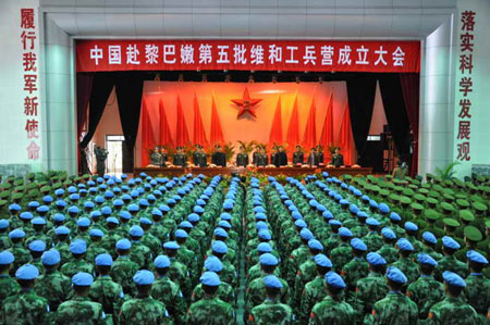 應(yīng)聯(lián)合國請求,經(jīng)中央軍委批準(zhǔn),中國赴黎巴嫩維和工兵營,今天(20日)在成都軍區(qū)駐滇某工兵團(tuán)正式成立。上午10時,在雄壯的軍歌聲中,頭戴藍(lán)色貝雷帽、著07式迷彩服的275名官兵英姿勃發(fā)地接受了檢閱。