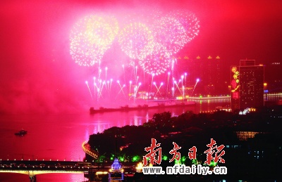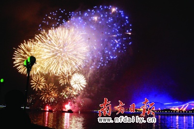今年燃放的煙花新穎別致。許多曾在北京奧運(yùn)會(huì)開閉幕式上令世界驚艷的煙花表演品種昨日在廣州匯聚一堂,貫穿整個(gè)晚會(huì)。