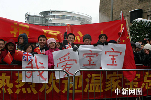 中新網(wǎng)倫敦2月2日電(記者 張朔)當(dāng)?shù)貢r(shí)間二月二日下午,即將結(jié)束訪英和訪歐行程的中國總理溫家寶踏雪到訪劍橋大學(xué),受到學(xué)子們的熱烈歡迎。有的學(xué)生甚至還打出了中文標(biāo)語:“我愛寶寶!