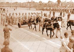 他說,當(dāng)時(shí)炮兵方隊(duì)是第四個(gè)通過天安門廣場(chǎng)的隊(duì)伍,以輕迫擊炮、重迫擊炮、戰(zhàn)防炮、山炮和野炮、榴彈炮、高射炮等7種上百門火炮陣容出現(xiàn);鹋谟尚〉酱,由低到高,依次前進(jìn),有的火炮是用騾馬拽著通過天安門的。