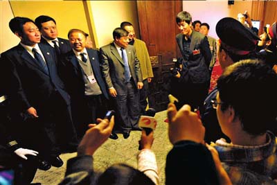 小組討論還未開始,21世紀(jì)飯店三樓第七會(huì)議室門口已擠了上百名記者。由于會(huì)議室太小、記者太多,大家都不能進(jìn)去旁聽。攝影和攝像記者10人一組,3分鐘一輪,進(jìn)場拍攝;而文字記者則只能將錄音筆送進(jìn)會(huì)場。會(huì)議室里一下子放了30多個(gè)錄音筆。