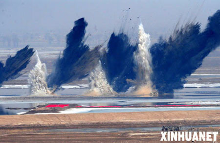 記者看到,這個河段的主河道還被厚冰覆蓋著,大堤外已經鋪起一個大大的紅色T字形參照物,這是為飛機投彈指示方位的。11時25分左右,3架銀色轟炸機穿過云層,飛抵黃河上空,進入投彈區(qū)域。