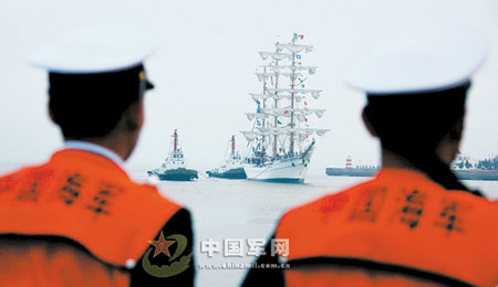 彩旗在風(fēng)中飄揚(yáng),禮炮在空中響起。4月18日晚7時(shí)許,美麗的青島港迎來了參加中國海軍60周年慶典的第一位“客人”——墨西哥的“夸烏特莫克”號(hào)風(fēng)帆訓(xùn)練艦。慶祝中國海軍成立60周年多國海軍活動(dòng),由此拉開了帷幕。