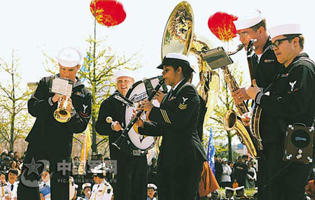美國(guó)海軍派出的7人小樂(lè)隊(duì)音色韻味十足,一上場(chǎng),就掀起一陣熱潮。樂(lè)手們情不自禁地走到樂(lè)池邊,近距離為觀眾演奏了5首樂(lè)曲。