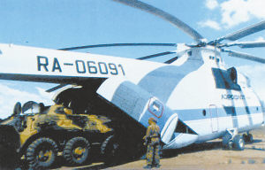 米-26貨艙位于機(jī)身的中后部,可裝載總重量20噸以上的坦克、步兵戰(zhàn)車、自行榴彈炮、裝甲偵察車等輜重;可容納80名全副武裝的士兵,安放60副擔(dān)架和3名醫(yī)護(hù)人員,相當(dāng)于著名的C-130“大力神”運(yùn)輸機(jī)的載重能力,是名副其實(shí)的空中“大力士”。