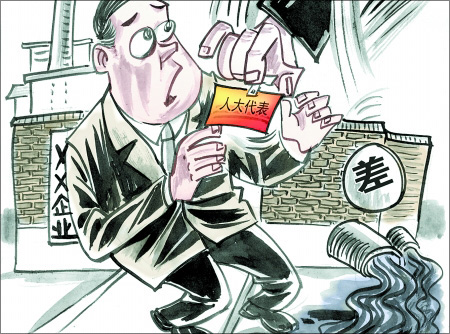 輝縣市有一家造紙廠的負責(zé)人是新鄉(xiāng)市人大代表,該造紙廠治污設(shè)備長期閑置,經(jīng)常偷排污水,環(huán)保部門去檢查時,負責(zé)人總是敷衍,由于其特殊的身份,在當(dāng)?shù)卦斐闪瞬涣嫉挠绊。這次對人大代表調(diào)研評價時,環(huán)保部門給其一個“差”的評語,這位人大代表再次提名時沒能通過。