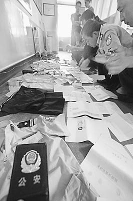 民警在搜查周某暫住在天平營村的住所時,查獲了偽造的內(nèi)蒙古自治區(qū)公安廳廳長令、調(diào)函,警用人員報告書、成立派出所報告書、安置卡,購買了警服、警號、警銜、警官證和法律法規(guī)書和私刻的公章以及冒充自治區(qū)公安廳某領(lǐng)導(dǎo)簽署的調(diào)他任薛家灣公安局局長的調(diào)令等大量假證件。(本報記者 李玉波)
