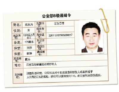 施永兵,曾用名戴兵,男,出生于1970年5月8日,江蘇南京棲霞區(qū)石埠橋村人,身份證號(hào)碼為320113197005080817。此人操江蘇口音,體型微胖,方臉,身高175厘米。公安機(jī)關(guān)以其涉嫌非法經(jīng)營,正在全力追捕。