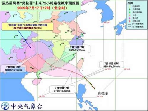 受“莫拉菲”及其外圍云系的影響,17日晚上到18日白天,東海南部海面、巴士海峽、巴林塘海峽、臺灣海峽、臺灣以東洋面、南海北部和東部海面、臺灣省及其沿海、福建沿海、廣東東部沿海將有 7-9 級大風,“莫拉菲”中心經(jīng)過的附近海面的風力可達 10-12 級。臺灣大部、福建東南部 、廣東東南部將有大到暴雨,其中臺灣東部和南部的部分地區(qū)有大暴雨或特大暴雨。