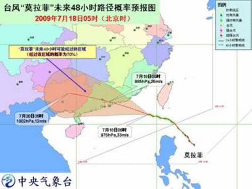該警報(bào)顯示,今年第6號強(qiáng)熱帶風(fēng)暴“莫拉菲”(MOLAVE)已于18日凌晨進(jìn)入南海東北部海面,隨后于早晨5時加強(qiáng)為臺風(fēng)。18日早晨5時其中心位于廣東省惠東縣東偏南方大約450公里的海面上,就是北緯21.2度、東經(jīng)119.0度,中心附近最大風(fēng)力有12級(33米/秒)。