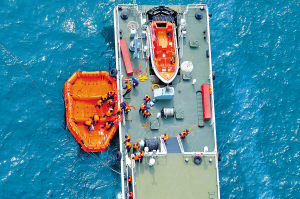 接到求救信號后,海上指揮所迅速派出各支救援分隊趕往事發(fā)海域。艦載救護直升機、海上傷員搜索定位裝置、拋射式救生索、救生吊桿、漂浮擔架、漂浮式救生網、救生浮臺、充氣滑梯等10多種新型海上醫(yī)療救護裝備紛紛亮相,大顯身手,上演了一幕幕扣人心弦的海上生命大救援。