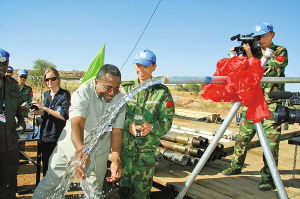 蘇丹是一個(gè)極度缺水的國(guó)家,常年動(dòng)亂的一個(gè)重要原因就是爭(zhēng)奪水源。西方地質(zhì)學(xué)家勘測(cè)后曾認(rèn)定北部達(dá)爾富爾地區(qū)無(wú)地下水。北京軍區(qū)給水團(tuán)維和官兵的主要任務(wù)是在這里進(jìn)行水源勘察并構(gòu)筑供水井,解決達(dá)爾富爾地區(qū)維和部隊(duì)及維和警察生活保障用水。去年10月16日上午,一股清泉從火成巖中噴涌而出,標(biāo)志著我給水團(tuán)官兵開(kāi)創(chuàng)了聯(lián)合國(guó)維和部隊(duì)用水自給的先河,同時(shí)也書(shū)寫(xiě)了我軍工兵首次在國(guó)外找水打井成功的歷史。