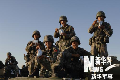 7月21日,在“和平使命-2009”中俄聯(lián)合反恐軍事演習(xí)現(xiàn)場,野戰(zhàn)兵站為參演的陸軍戰(zhàn)斗群某裝甲步兵分隊(duì)前送180人份新型野戰(zhàn)自熱食品,讓正在演習(xí)場執(zhí)行任務(wù)無法回野營村就餐的參演官兵吃上了熱菜熱飯。這是此次聯(lián)合軍事演習(xí)開始以來首次在演習(xí)場采取野戰(zhàn)自熱食品保障。 (崔秀文、顏云鵬)
