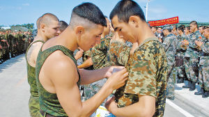 這時(shí),一名俄方隊(duì)員從褲兜里掏出一枚徽章,遞到對(duì)面的中方隊(duì)員手中。由于比賽在即,中方隊(duì)員接過(guò)徽章后就往褲兜里放。哪知,俄方隊(duì)員迅速?gòu)乃种心眠^(guò)徽章,親手給中方隊(duì)員佩戴在了迷彩短袖衫上。這名中方隊(duì)員會(huì)心一笑,與其再次擊掌,然后共同抓起拔河的大繩。觀戰(zhàn)的中俄官兵看到這一情景,立即報(bào)以熱烈的掌聲。