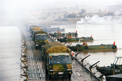 今天(11日)凌晨5時,蘭州軍區(qū)某舟橋團在黃河某渡口架設(shè)一座250多米長的浮橋。6時整,由700多輛輪式車輛組成的摩托化部隊隆隆駛過。11時,兩架搭載蘭州軍區(qū)某師前指和特戰(zhàn)分隊人員的民航客機,從西北某機場升空向東北某機場飛去。與此同時,兩列運載裝甲裝備、特種裝備和工程機械的專列分別在銀川、青銅峽火車站整裝待發(fā),準(zhǔn)備奔向東北大地。至此,“跨越—2009”系列實兵檢驗性演習(xí)拉開序幕。